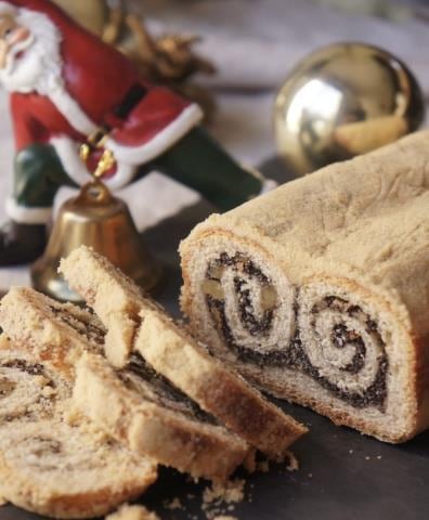 シナモン、ナツメグ、ジンジャー、バニラ香る生地でたっぷりの香ばしいケシの実とロースト胡桃を使用したフィリングをユニークな形に巻き込みました。当店が毎年ブラッシュアップしている店主自慢の人気のクリスマスの焼菓子です。ザクッ!ほろっ!プチプチ!とした食感が次から次に食べたくなってしまうモーンシュトレン。周りを白砂糖ではなくきび糖でコーティングする為、どこをかじっても上品なコクと甘さ、そしてスパイスの心地良さが口中に広がります。